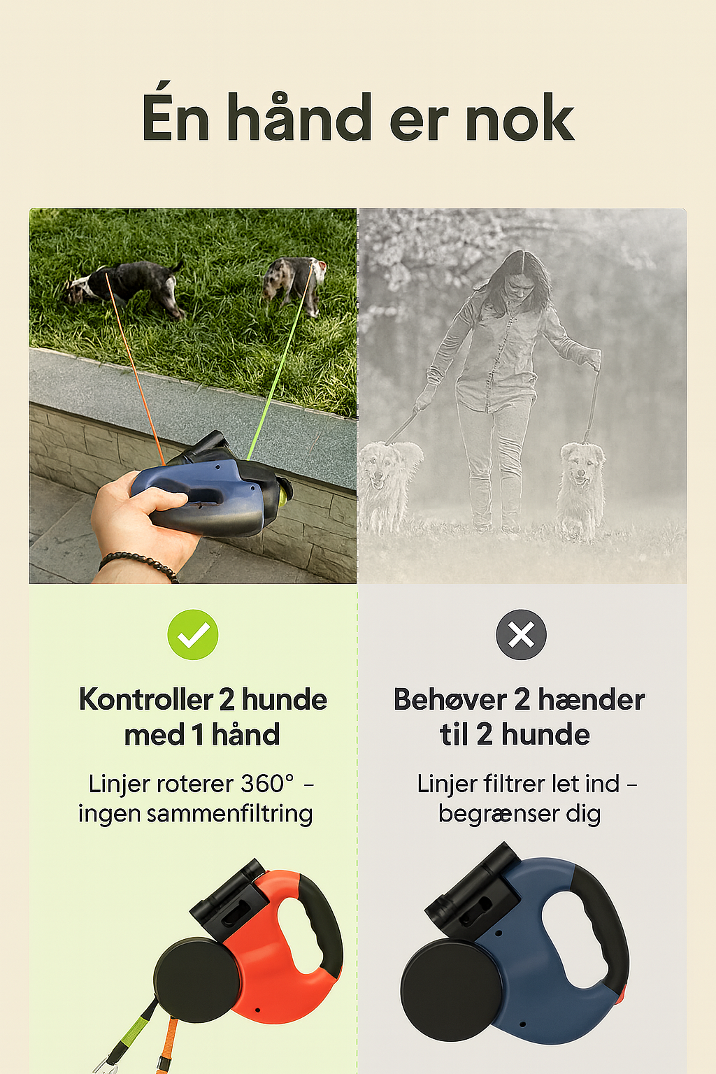 🐾 Ingen sammenfiltrede liner – altid styr på to hunde.